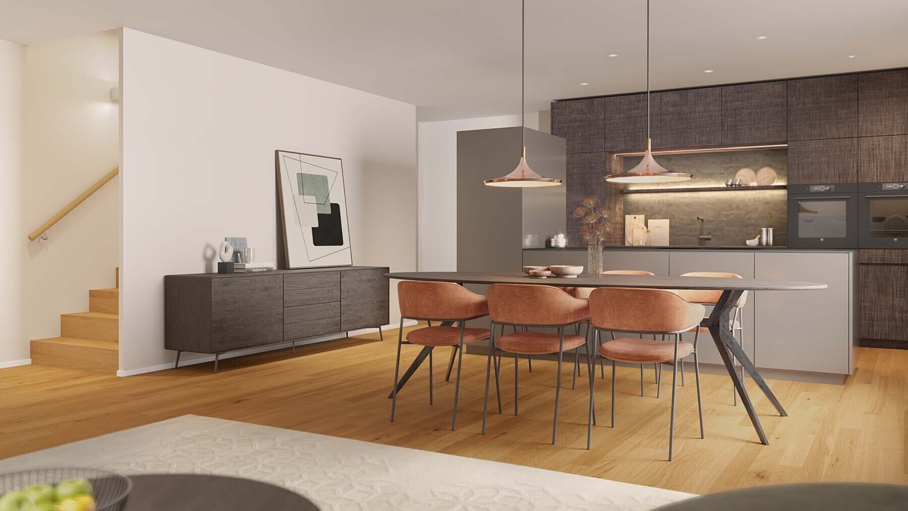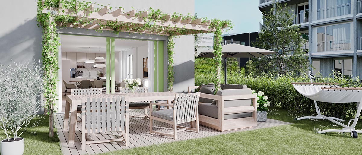 The three-storey demi-detached houses are impressive thanks to their well-thought-out floor plan and first-class interiors. The private garden and long terrace make the perfect, luxury dream home. These architectural gems fit in seamlessly with the surroundings and the neighbourhood. Plenty of green space between the individual houses creates an excellent microclimate and guarantees privacy.